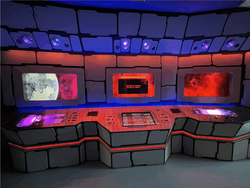 The Space Bridge consists of 6 ‘stations’, each with their own upper display monitor. The entire bridge is divided into symmetrical halves, with 3 stations on each side. On each half, one station has 3 analog buttons and a trackball, one station has 6 analog buttons and a touchscreen display, and one station has a joystick and 6 analog buttons arranged in a triangle. As of right now, each station is driven by its own separate computer, and the upper screens are driven by their own computer as well. Unfortunately, in its current state, the upper display screens are disconnected from the computers that manage the input of the Space Bridge, and so its current (Spring 2025) function at the ETC is to display a space-themed animated wallpaper that runs on a loop (and can also display a popup to serve as a welcome message or banner on the center screen of each half).
