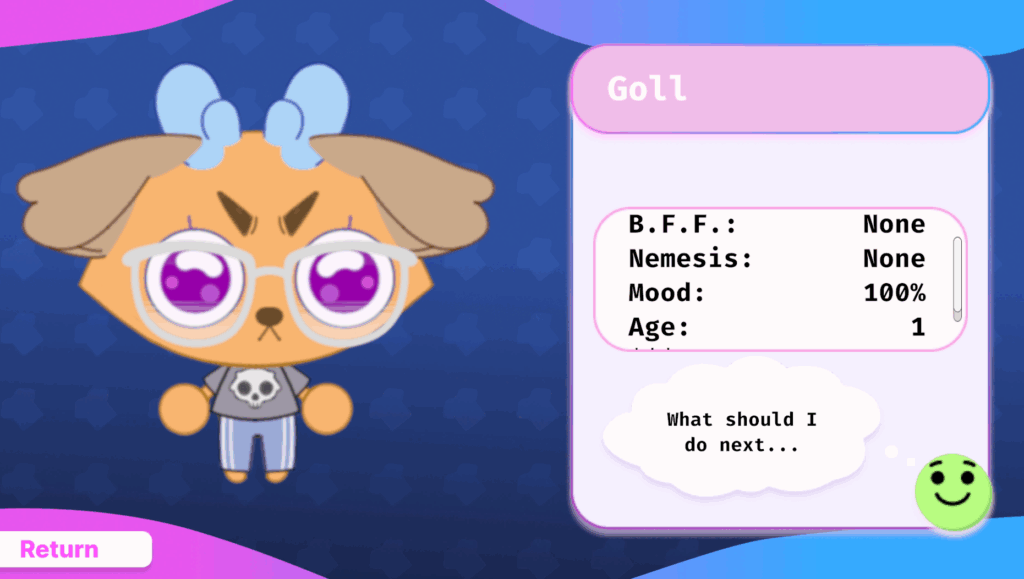 We have conceived of five roles for the characters. I’ll just summarize them quickly: Engineers fix broken objects around the city, making them useable to others; Researchers work to progress broader meta-goals that represent the scientific progress of the community at large; Entertainers work at establishments like cafes or performance stages to provide a place for others to restore their mood (which affects the rate at which they work); Caretakers raise plants in a greenhouse; Safety Officers patrol randomly.