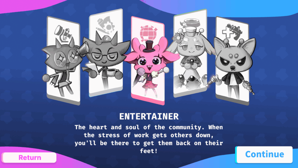 You might observe, the function of the last two roles seems a little undefined. Well, there’s a chain of reasons for that. It all boils down to thinking about scope, but in the shorter-term timeframe, we’re interested in observing how people understand the roles that they’re selecting for their character, and whether or not they ‘mind’ or even notice if the role they selected for their character actually contributes directly to the same goal as everyone else. In other words, if a player creates a Safety Officer because they want their character to be a cool looking security guard, will they be satisfied if all that entails is that their character looks menacing and stands in front of an important entrance way the whole time? Our experience is largely designed to be something that you don’t watch closely for long stretches of time. It may not be worth it to invest a lot of design time into complicated numerically driven systems if a player won’t particularly care about them or perhaps even notice them.