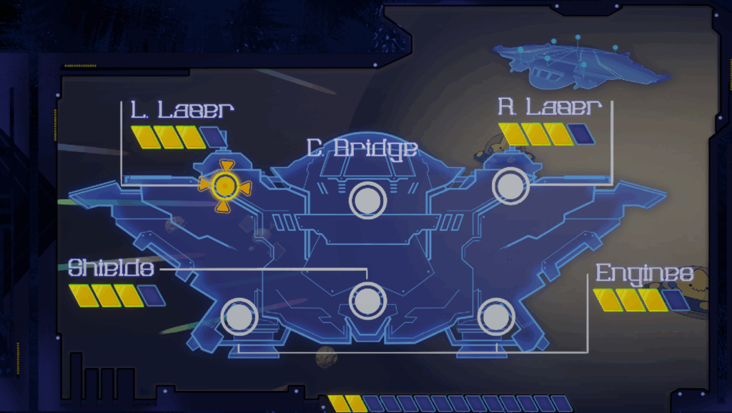 The roles of the players are the Navigator, who uses the joystick and buttons to guide the ship and blow-up obstacles along the flight path; the Captain, who has access to both a view to the outside on their top screen and UI information about the goals and status of the ship on the touchscreen; and the Engineer, who is able to manage the power of the ship and decide which systems should go down for repairs and when.