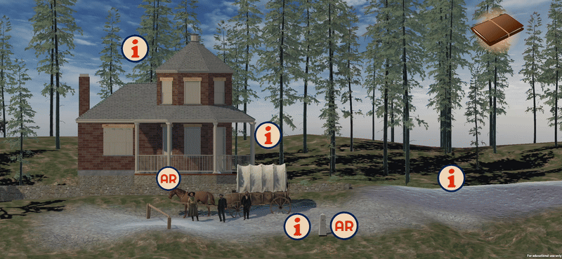 We received very valuable feedback from our guests about what worked well in our prototype, and what could be improved. In general, players strongly felt the time period that our app was placing them in, and they were interested in that setting and history. One of our primary areas for improvement is better guiding the player, so they know what their goals are and don’t feel stuck or confused in the scenes when our team is not around to nudge them. We plan to flesh out the game’s quest system and integrate more UI and dialogue that will make the player experience clearer and smoother. Additionally, guests wanted more chances to dive deeper and learn more about the real historical context of the National Road. We had some of that present in our map scene, as players could click on an information icon and see a pop-up with some facts about the toll house building, though we will continue to add even more historical content in order to create a richer experience.